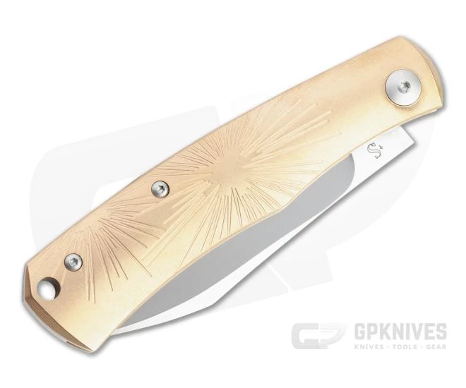 Handle:Â A crowned stainless steel back spring matches the spine of the blade and is fit securely between two slabs of contoured sandblasted bronze with starburst milling. The handle design provides a secure, comfortable grip with a nice heft in the hand from the solid bronze which will develop a natural patina over time. A hole at the pommel allows for lanyard attachment.