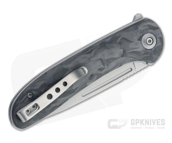 Handle: Solid gray titanium liners support subtly contoured marbled carbon fiber scales for a comfortable grip further enhanced by the proud liners. The simple handle shape is useful in multiple grips for added versatility, while the open construction reduces weight and is easy to clean. Time tested, the liner lock is straightforward to use, delivering secure lockup and smooth operation.