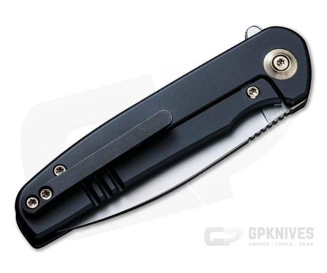 Handle: A clean and simple titanium handle consists of dual chamfered slabs joined in an open back construction with handsome bronze hardware complementing the black stonewashed finish with polished blue milling. A subtle index groove pairs with the flipper tab guard and pattern milling for a secure grip while the steel lock face equipped integral frame lock delivers smooth operation and solid lockup for safe use.