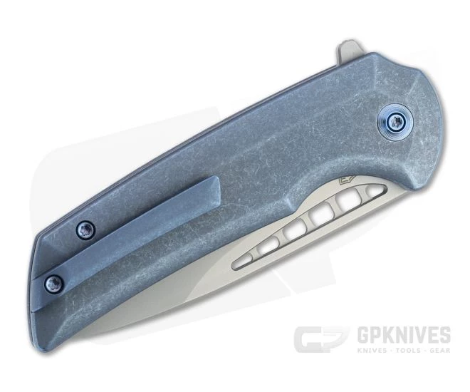 Handle: Barrel spacers joint the thick, heavily contoured titanium scales in a compact and comfortable handle. The neutral design allows for multiple grips with a deep index groove for added safety. The button lock mechanism is solid and secure for safe operation with intuitive operation. An inline pin allows for lanyard attachment.