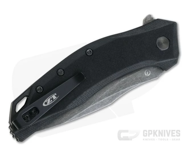Handle:Â Coarse black G-10 scales have been contoured and safely secured to thick, black coated stainless steel liners. This handle will resist the elements and any bumps or bangs along the way. It provides a comfortable, secure grip in nearly any condition. A strong knife requires a strong lock for secure use during the most minor to most difficult cutting task. ZT used one of the beefy liners for a simple lock that is easy to operate and dependable. A section of the back strap is exposed near the end with cut out lanyard loop for customization.